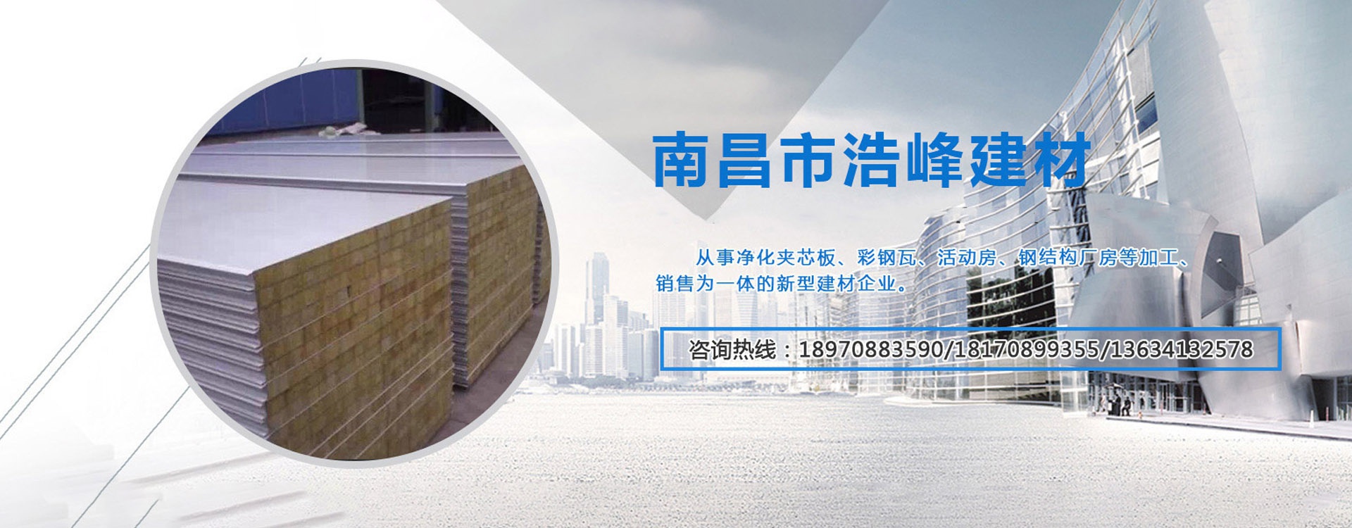 南昌市浩峰建材有限公司位于南昌市昌東工業園,交通便利,是從事凈化夾芯板、彩鋼瓦、活動房、鋼結構廠房等加工、銷售為一體的新型建材企業。公司設備精良,擁有目前精良的EPS彩鋼夾芯板設備。生產的彩鋼瓦、巖棉夾芯板、凈化板已廣泛應用于鋼結構屋面、墻面、凈化醫療工程、樓層、活動房、廠房、冷庫、辦公室分隔、室內吸音等。產品種類齊全...